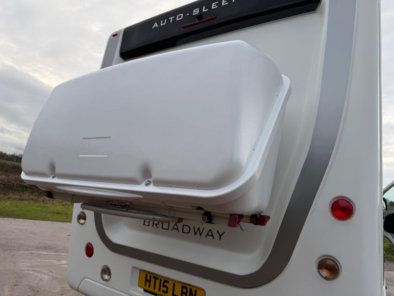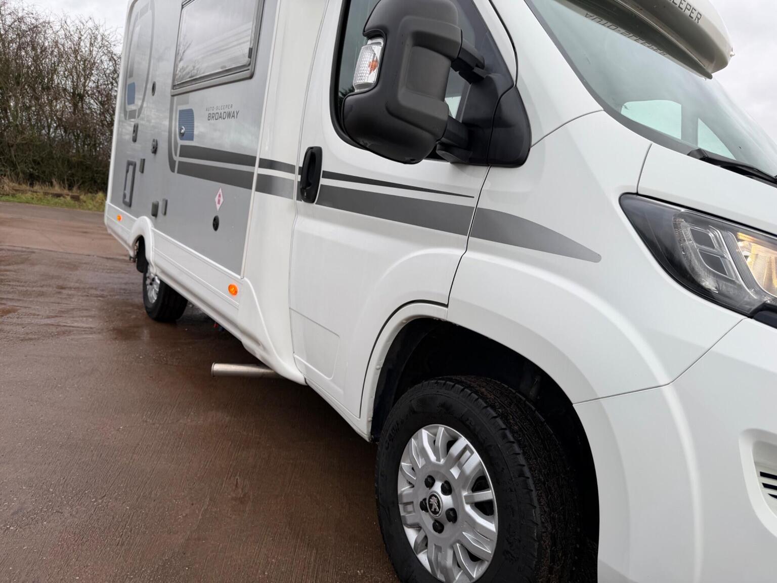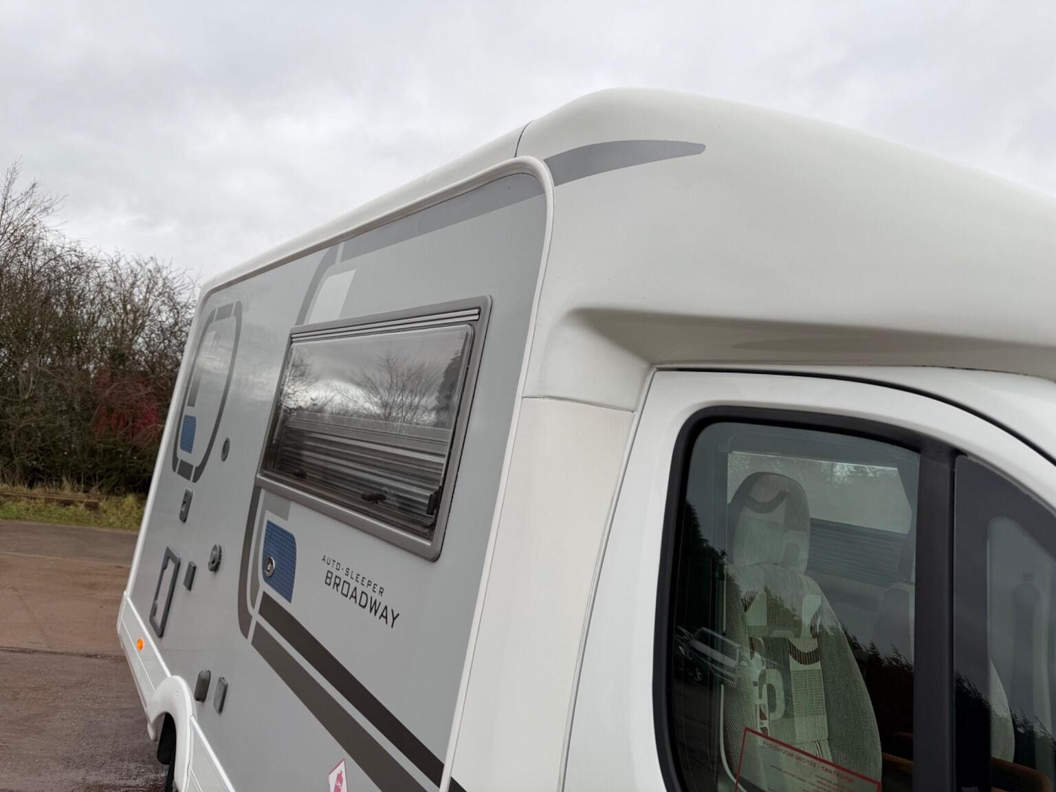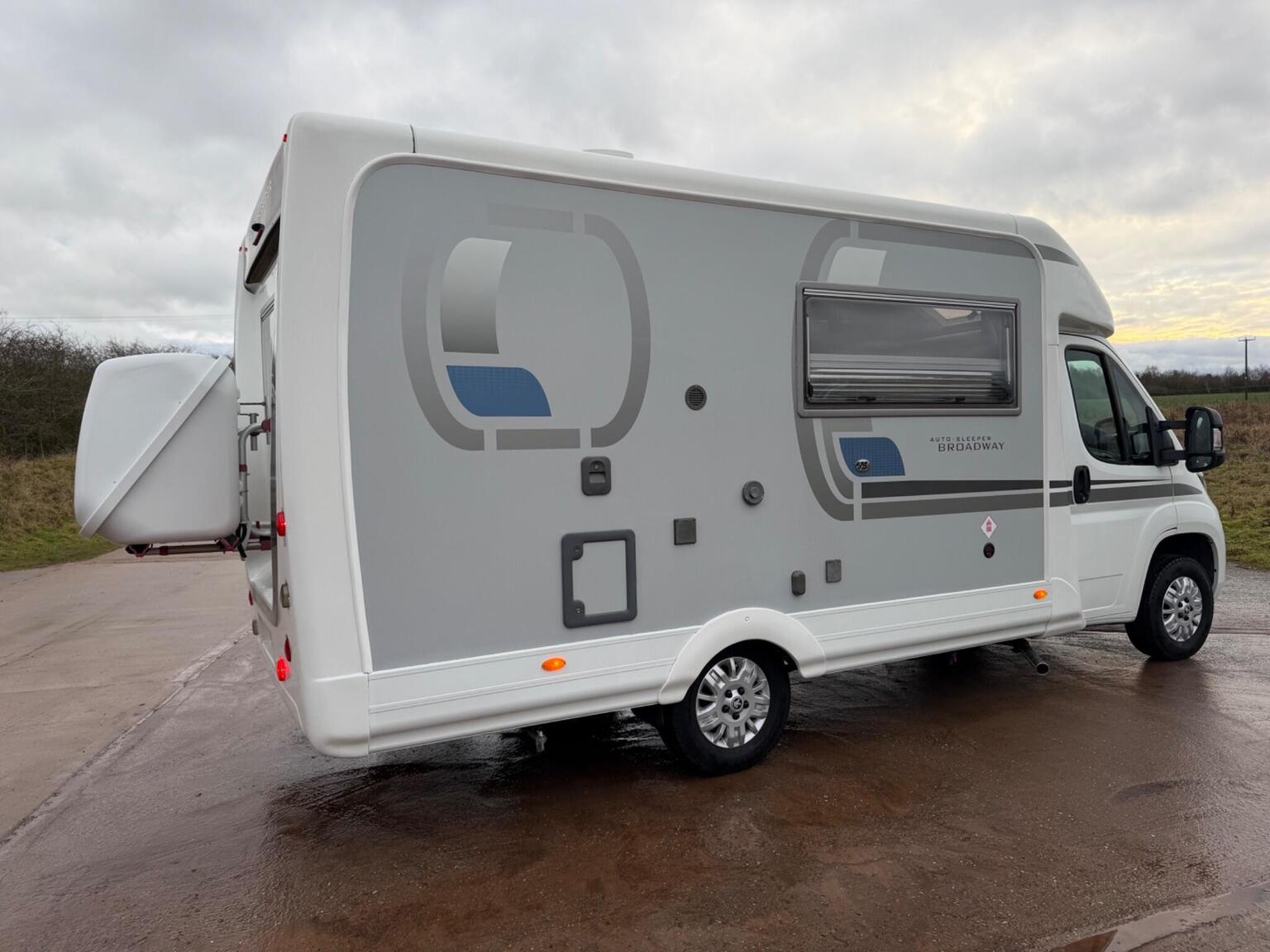 There is Ample storage throughout the vehicle, including a good size wardrobe and upper lockers, in addition to outside storage access. Externally, this Auto-Sleepers Broadway EK has a roll out awning, reversing camera, solar panel, BBQ point, alloy wheels, Status TV aerial, a 25 litre underslung gas tank, a Electric entrance step, and an external 230v socket.