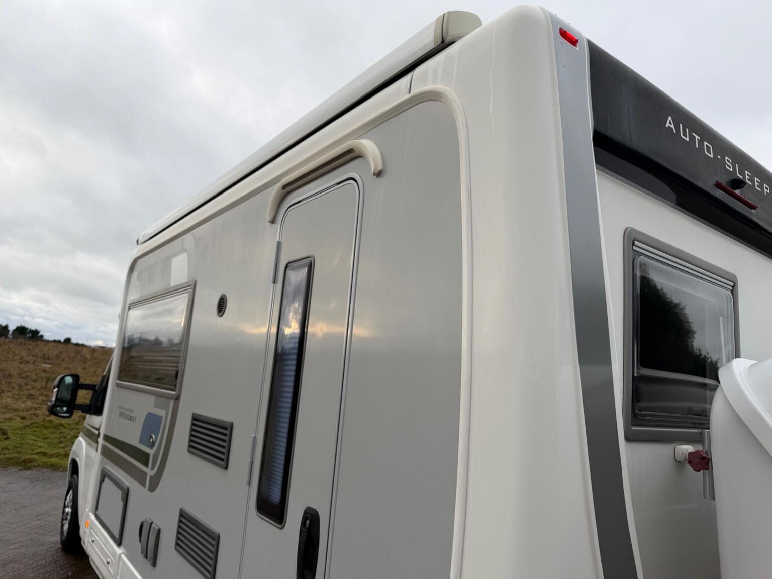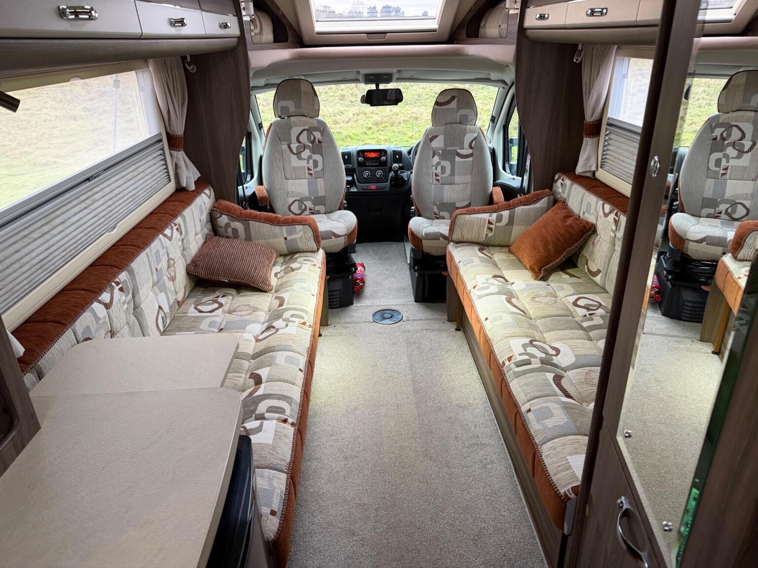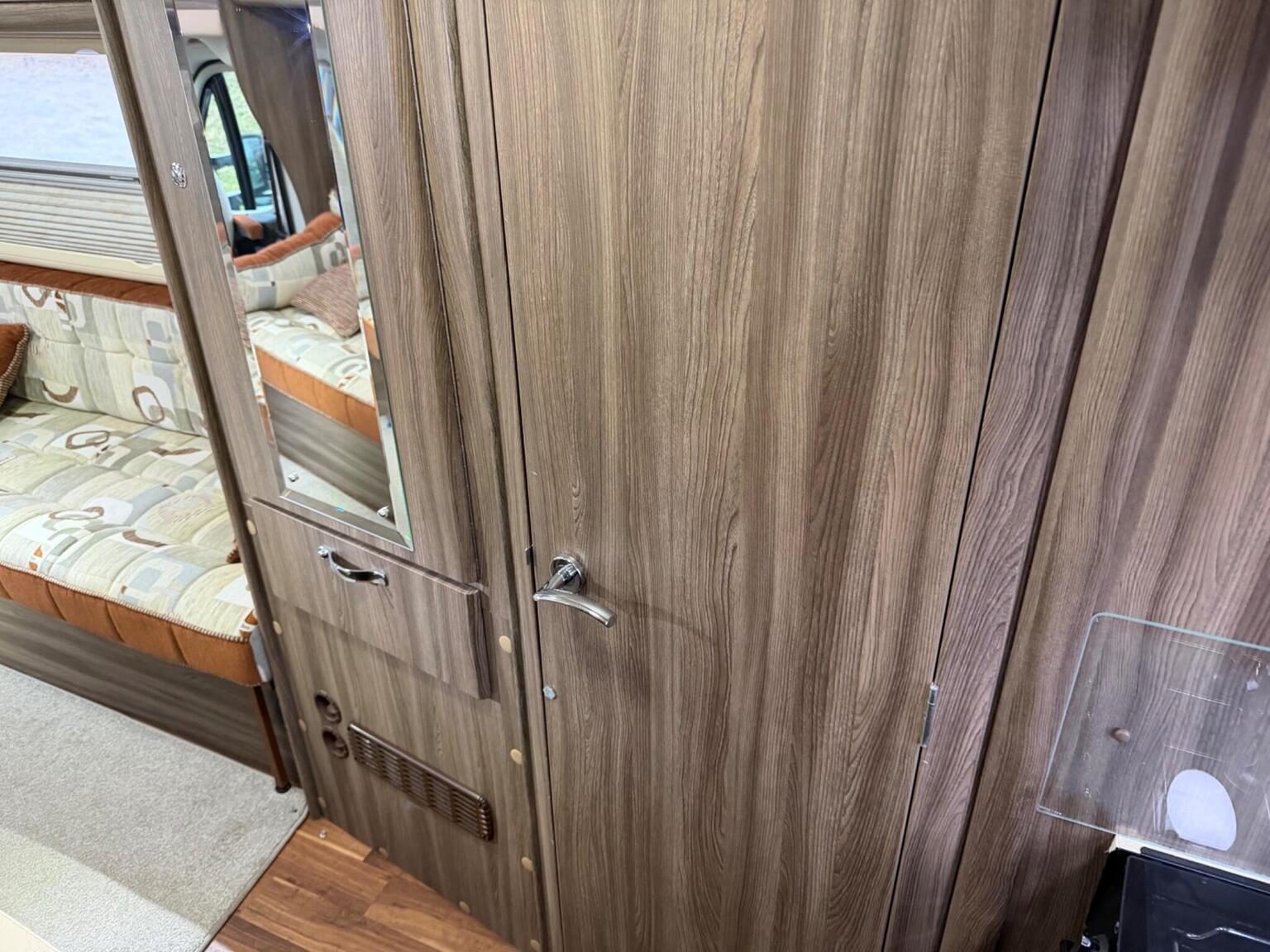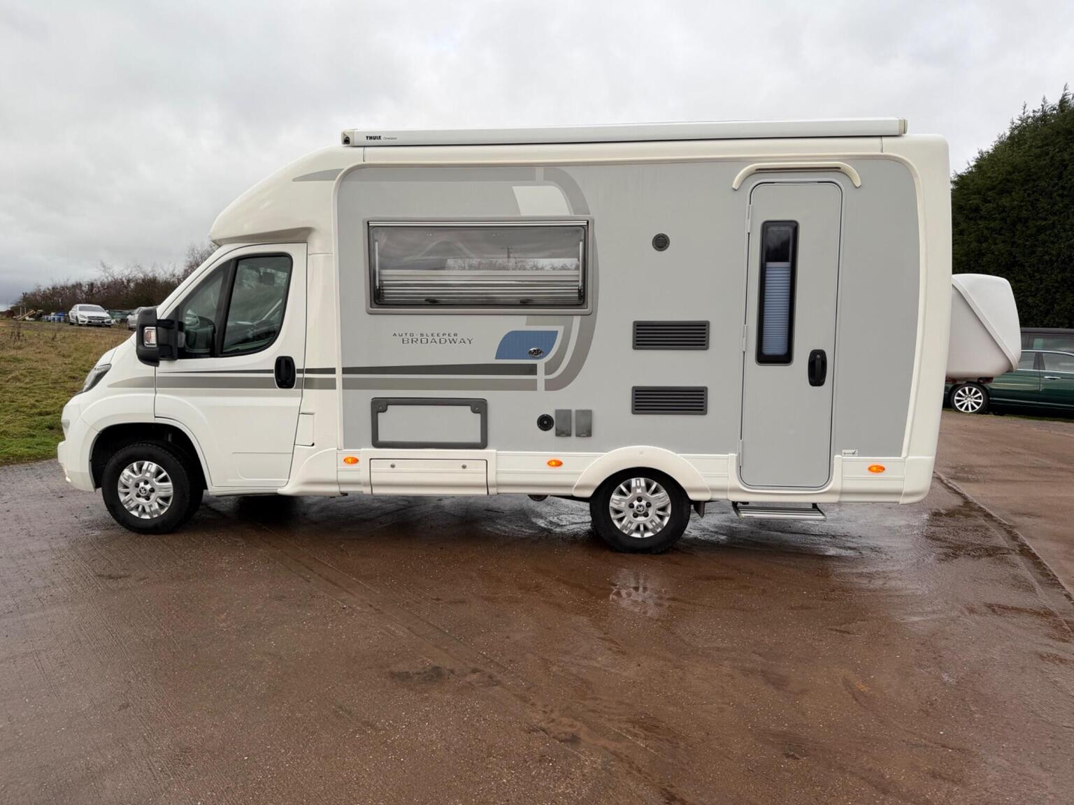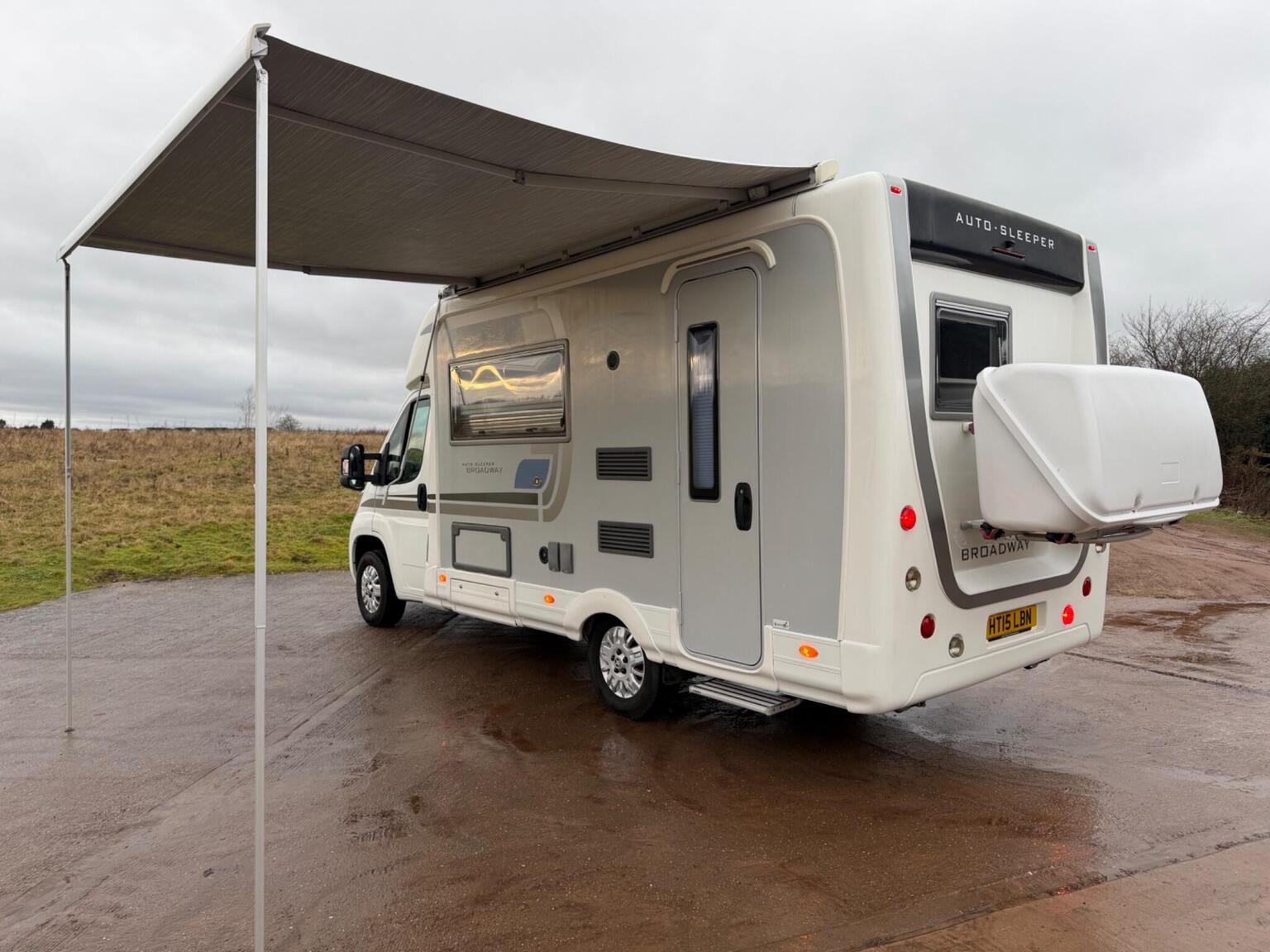 There is Ample storage throughout the vehicle, including a good size wardrobe and upper lockers, in addition to outside storage access. Externally, this Auto-Sleepers Broadway EK has a roll out awning, reversing camera, solar panel, BBQ point, alloy wheels, Status TV aerial, a 25 litre underslung gas tank, a Electric entrance step, and an external 230v socket.
