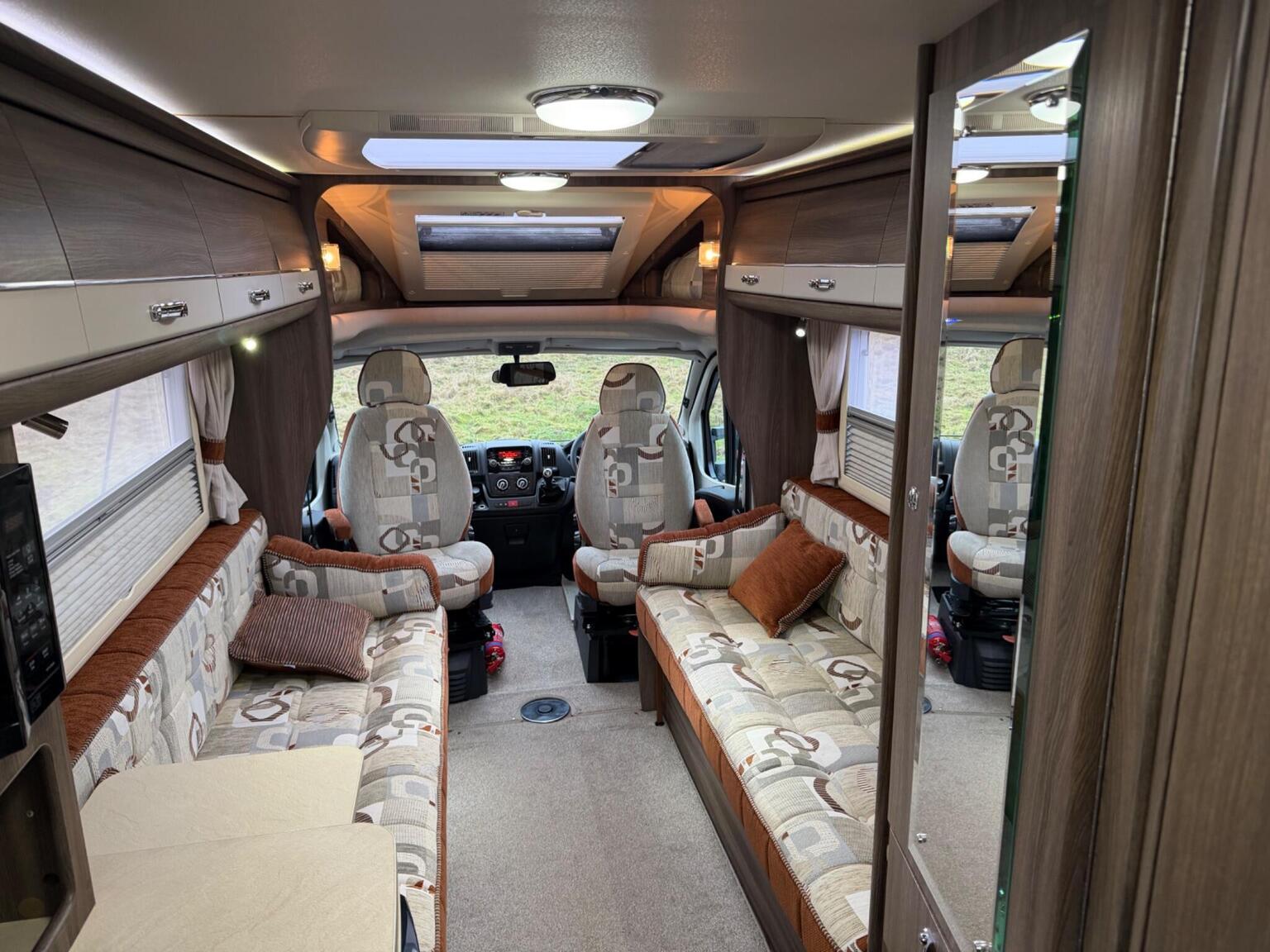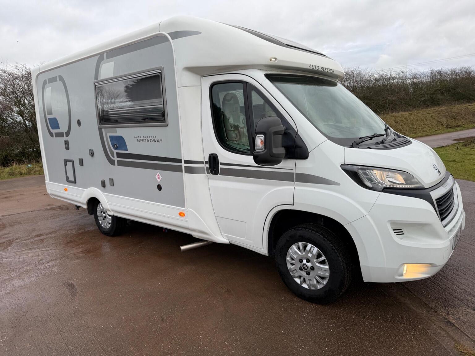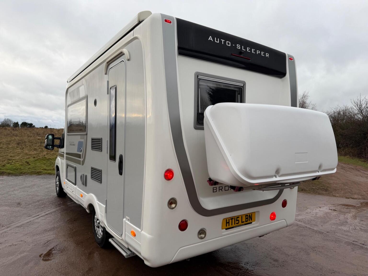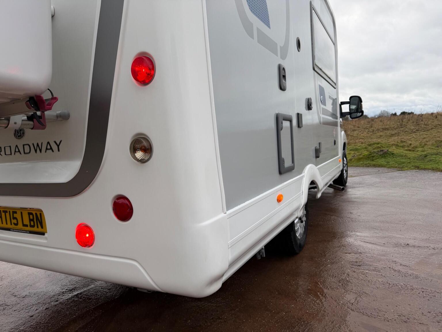 There is Ample storage throughout the vehicle, including a good size wardrobe and upper lockers, in addition to outside storage access. Externally, this Auto-Sleepers Broadway EK has a roll out awning, reversing camera, solar panel, BBQ point, alloy wheels, Status TV aerial, a 25 litre underslung gas tank, a Electric entrance step, and an external 230v socket.