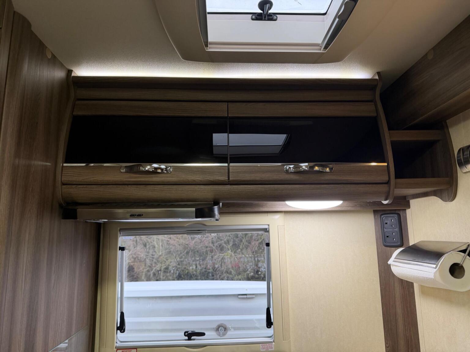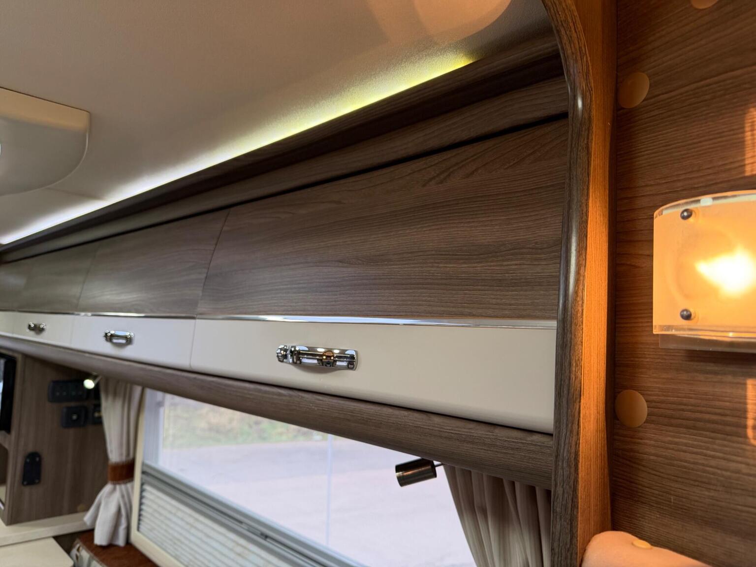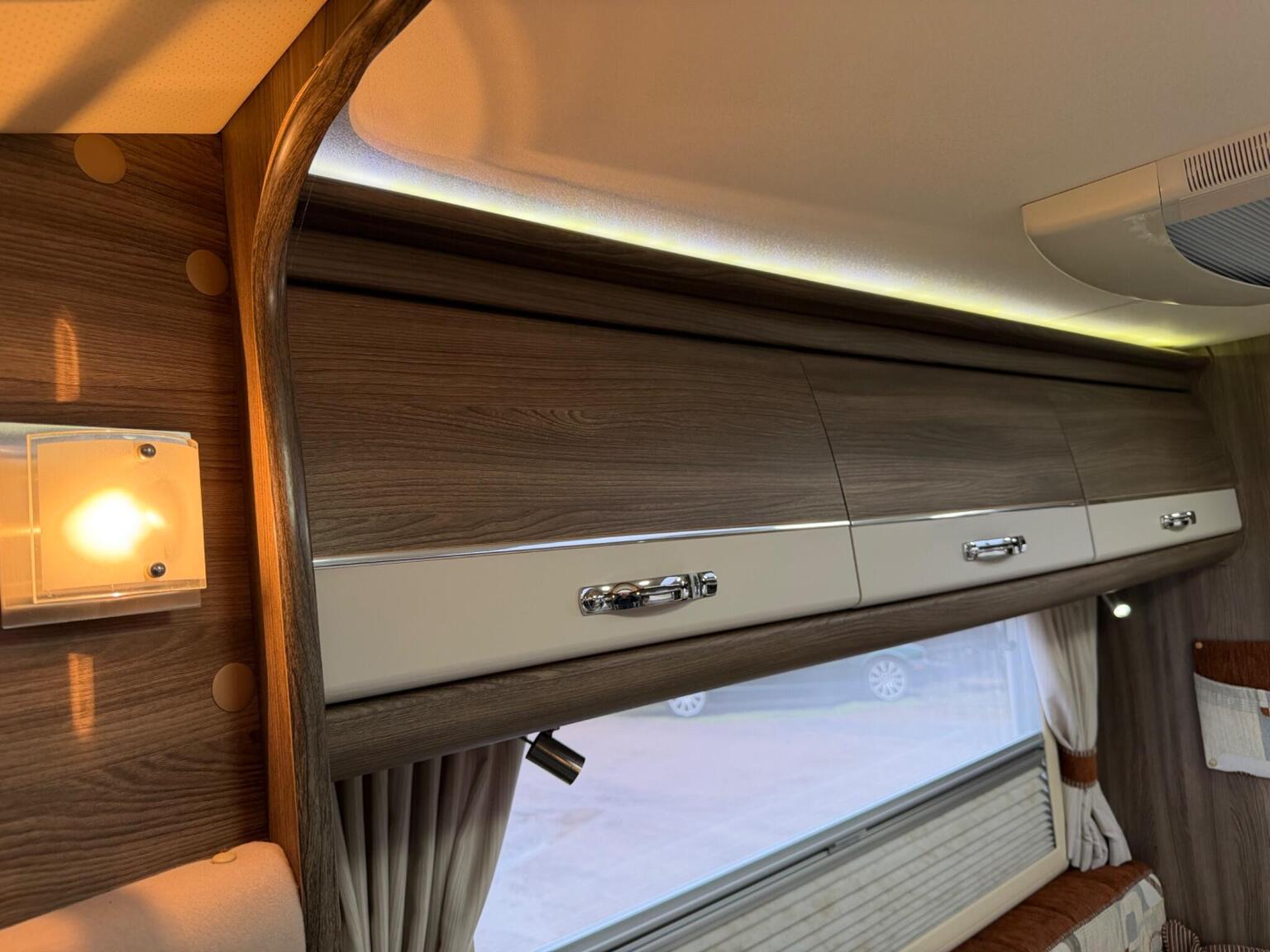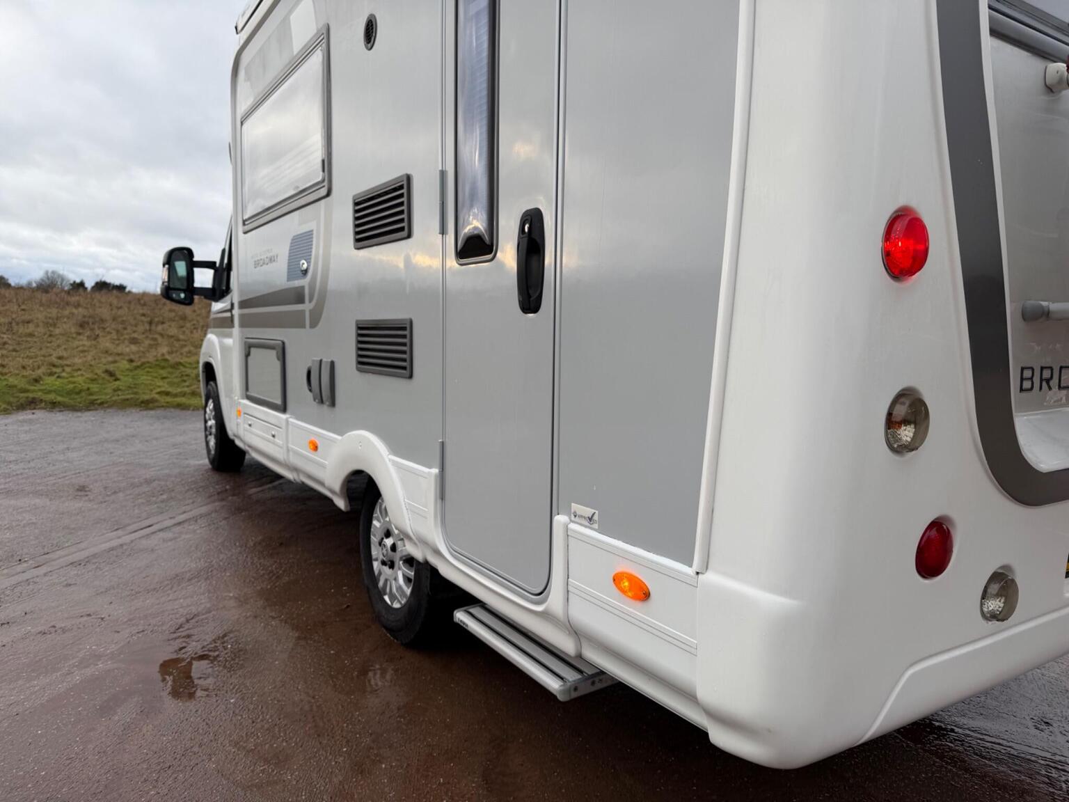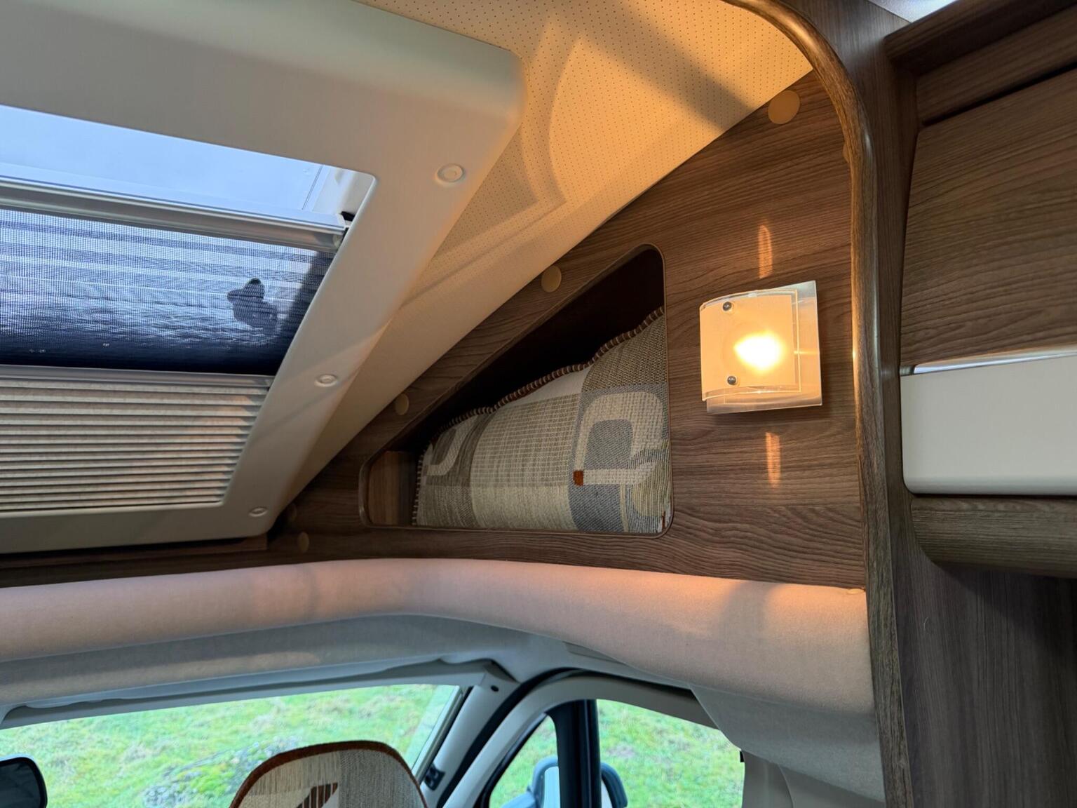 There is Ample storage throughout the vehicle, including a good size wardrobe and upper lockers, in addition to outside storage access. Externally, this Auto-Sleepers Broadway EK has a roll out awning, reversing camera, solar panel, BBQ point, alloy wheels, Status TV aerial, a 25 litre underslung gas tank, a Electric entrance step, and an external 230v socket.
