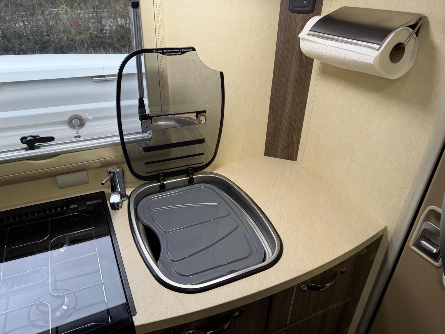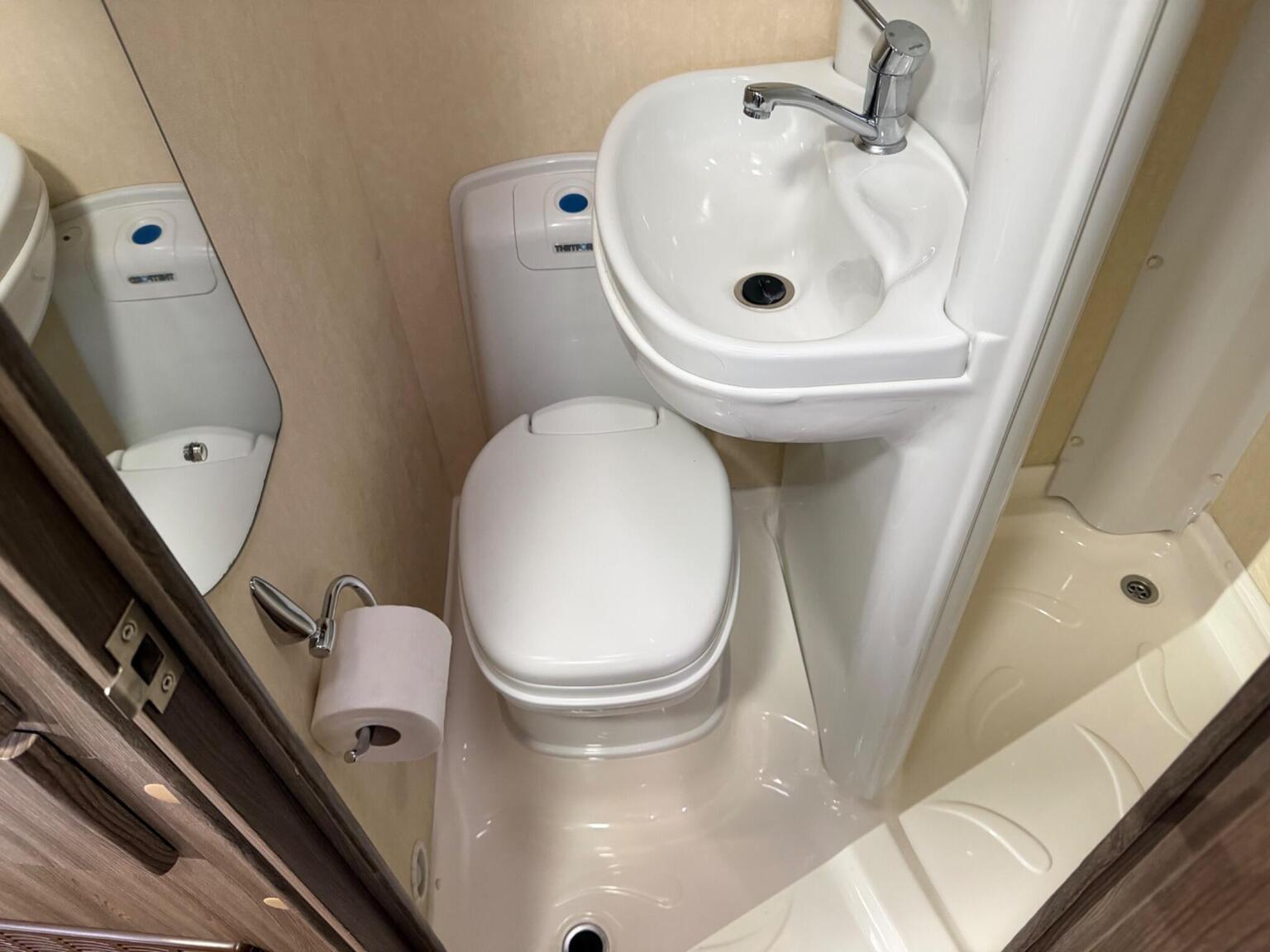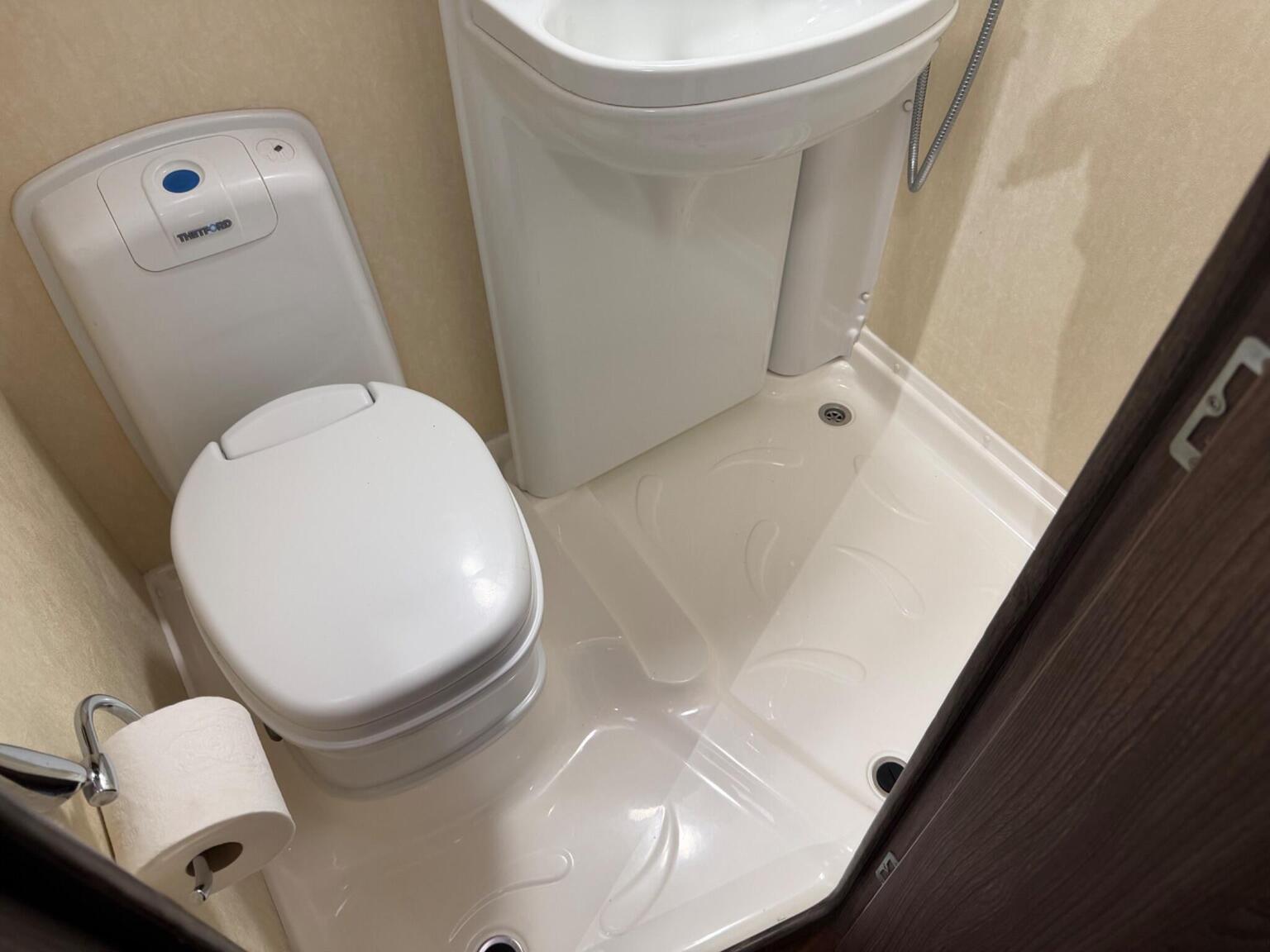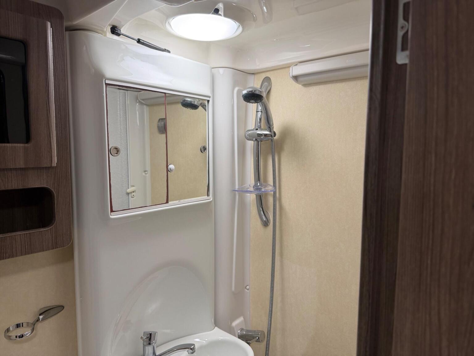This is a spacious motorhome with a lovely lounge configuration at the front that allows for a social space and easily makes into either 2 singles or a large double bed for the night. The area benefits from a huge panoramic window located above the cab, allowing for plenty of natural light, and there is ample storage space surrounding the lounge. Towards the back wall is the fully equipped kitchen, featuring a grill, oven, hob, sink, microwave, extractor fan, and an electric omni vent. This area offers ample cupboard space and worktop space. On the offside, you will find the washroom, which features a sink, shower, and toilet.