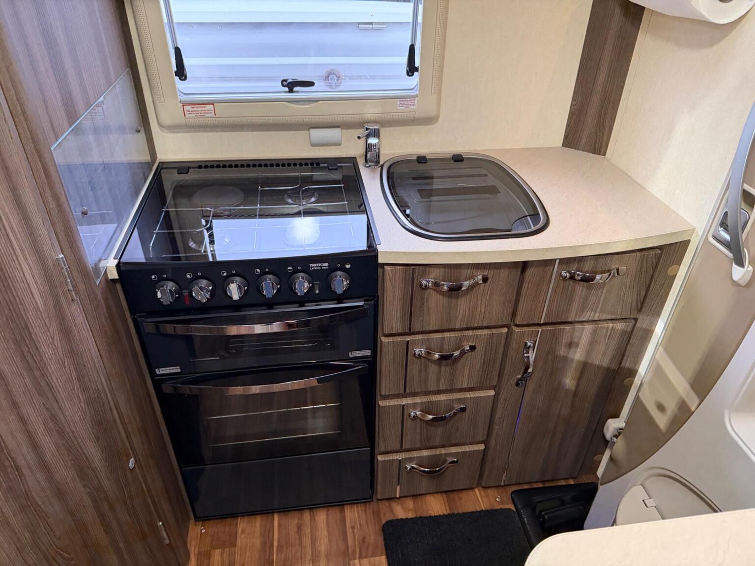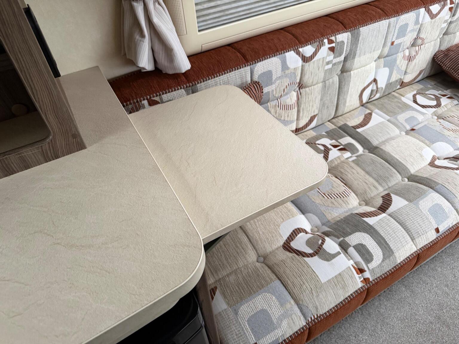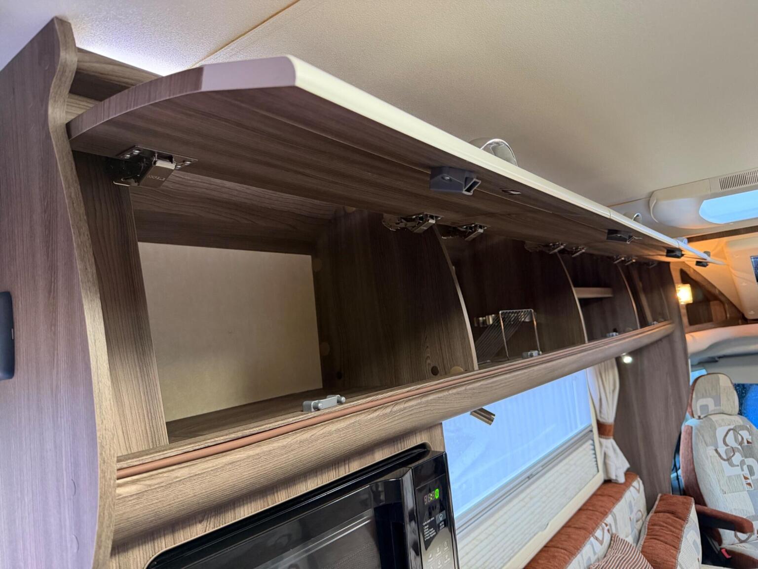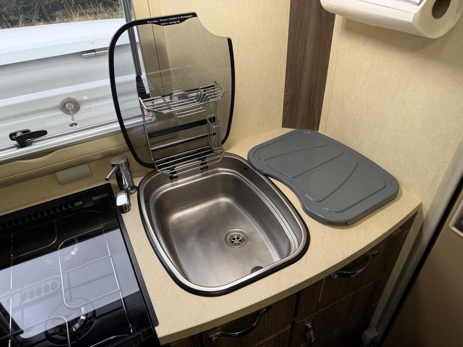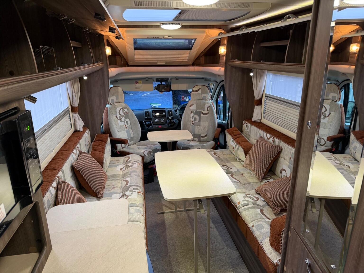 This is a spacious motorhome with a lovely lounge configuration at the front that allows for a social space and easily makes into either 2 singles or a large double bed for the night. The area benefits from a huge panoramic window located above the cab, allowing for plenty of natural light, and there is ample storage space surrounding the lounge. Towards the back wall is the fully equipped kitchen, featuring a grill, oven, hob, sink, microwave, extractor fan, and an electric omni vent. This area offers ample cupboard space and worktop space. On the offside, you will find the washroom, which features a sink, shower, and toilet.