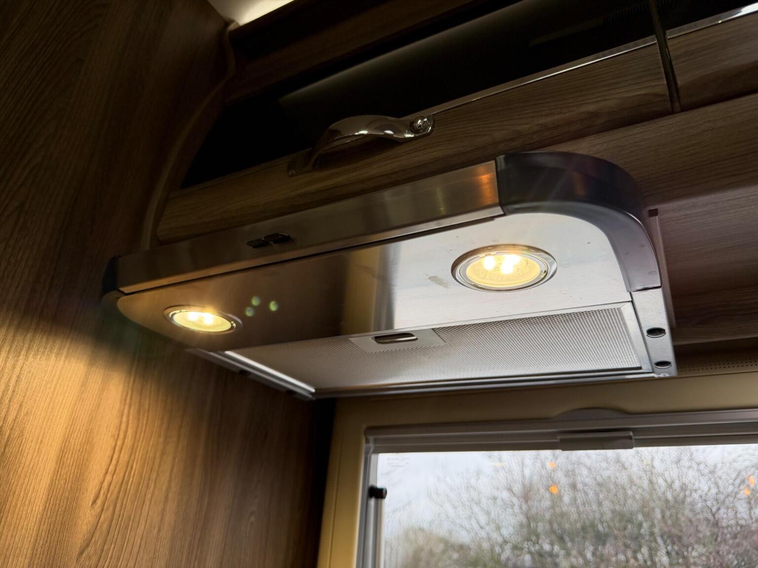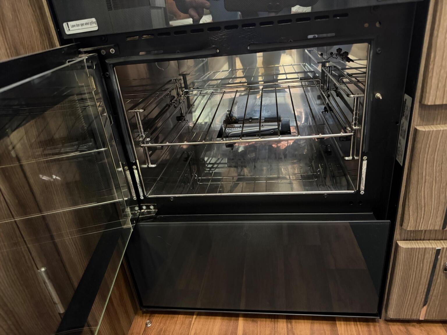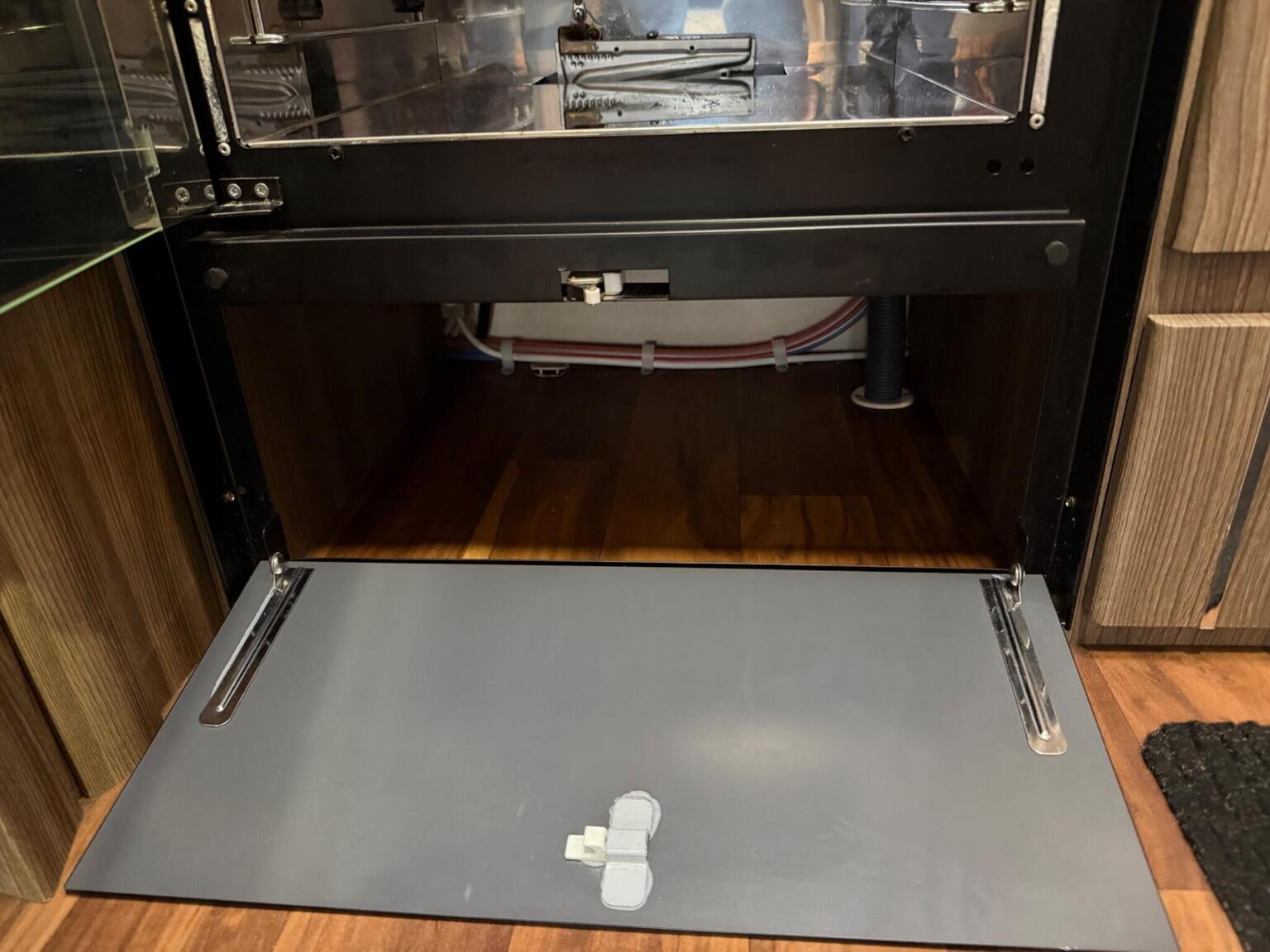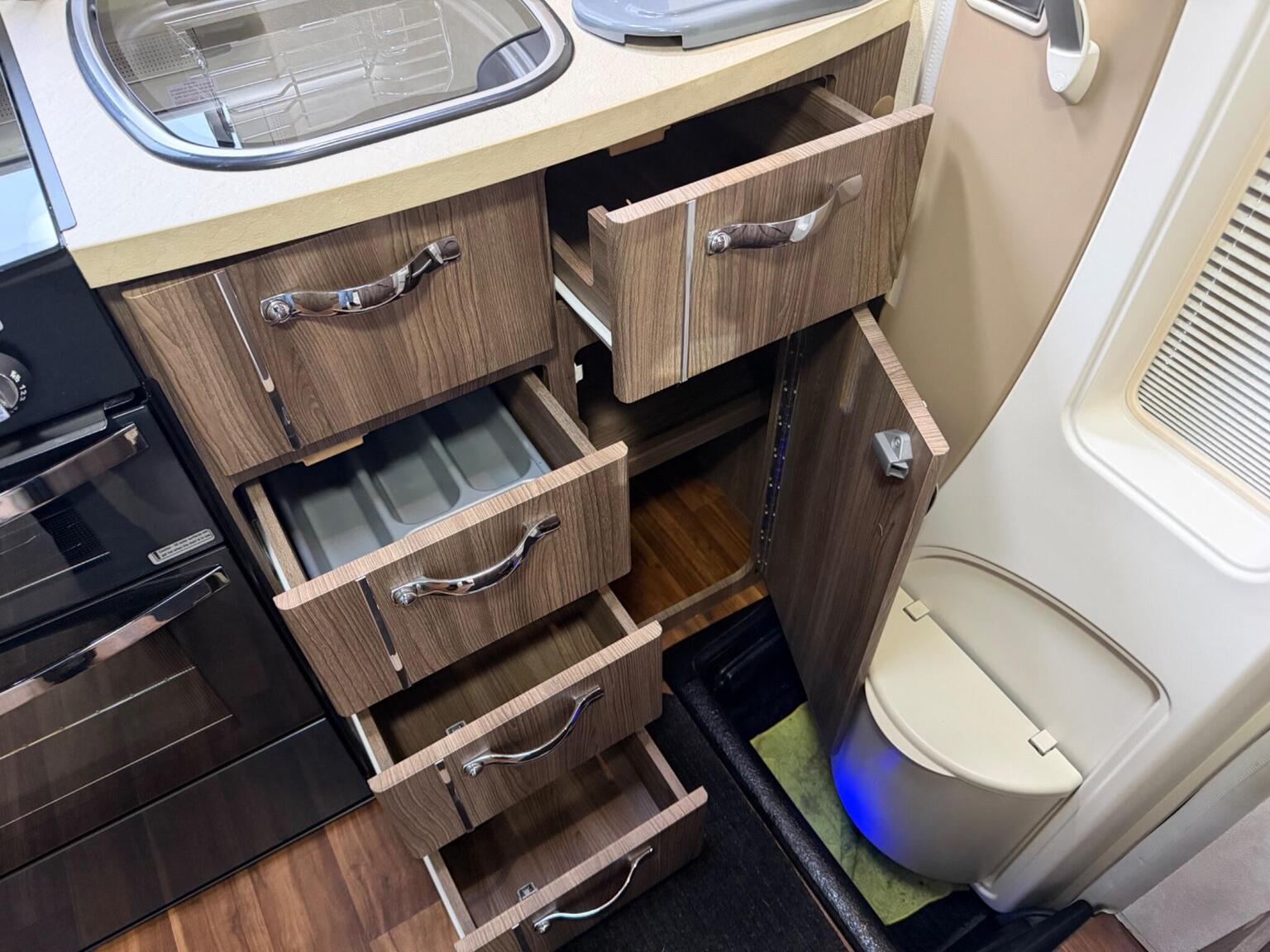 This is a spacious motorhome with a lovely lounge configuration at the front that allows for a social space and easily makes into either 2 singles or a large double bed for the night. The area benefits from a huge panoramic window located above the cab, allowing for plenty of natural light, and there is ample storage space surrounding the lounge. Towards the back wall is the fully equipped kitchen, featuring a grill, oven, hob, sink, microwave, extractor fan, and an electric omni vent. This area offers ample cupboard space and worktop space. On the offside, you will find the washroom, which features a sink, shower, and toilet.