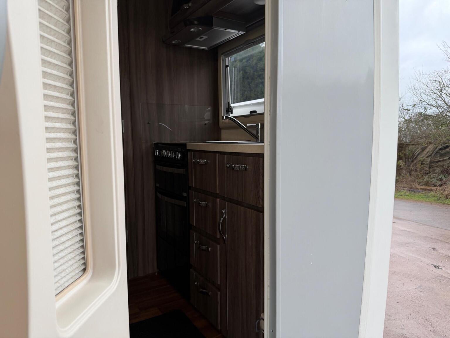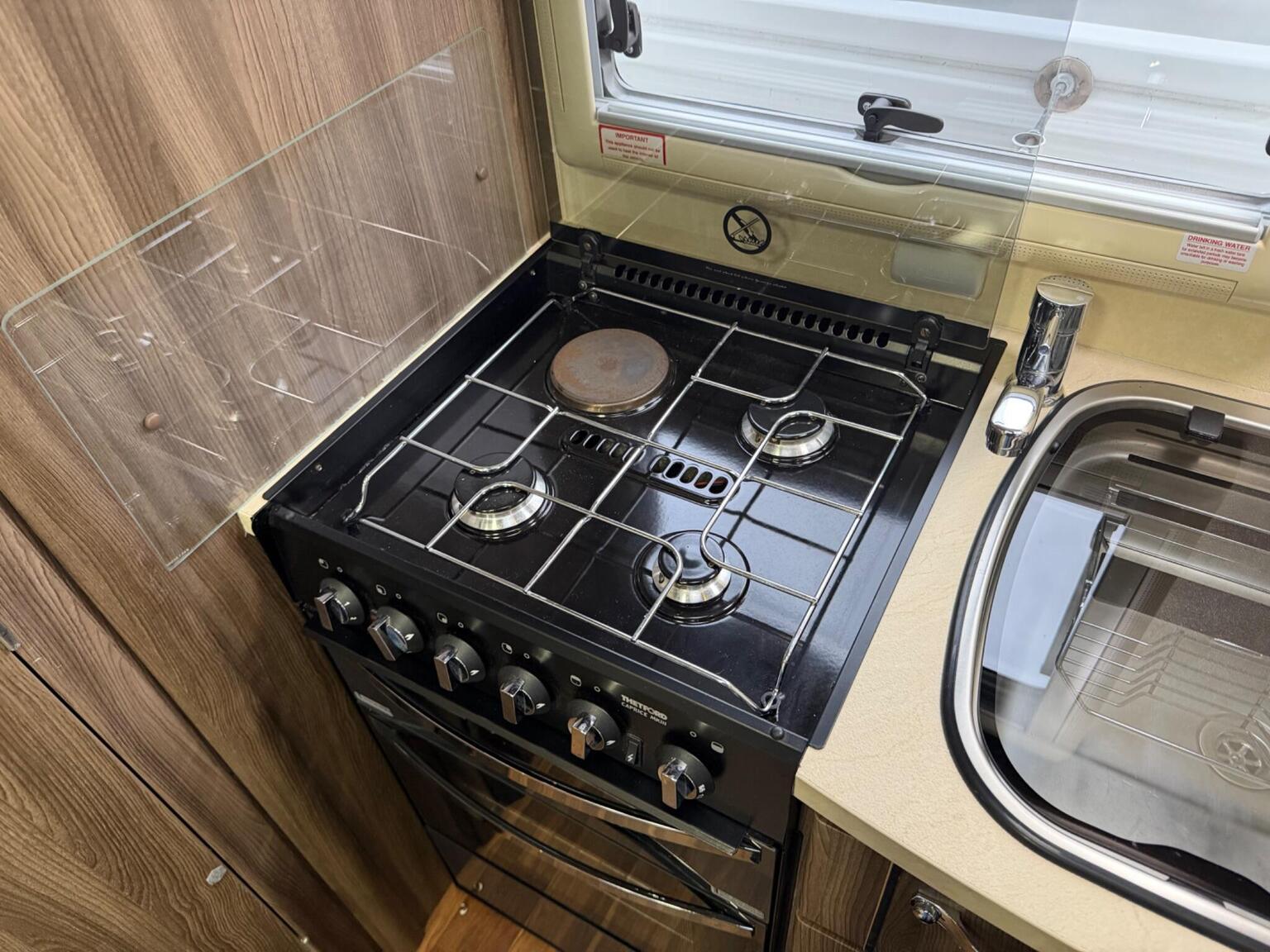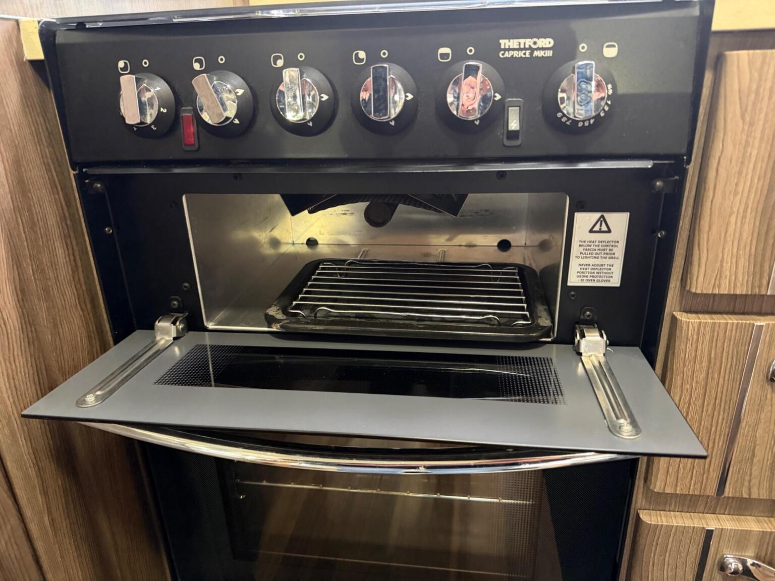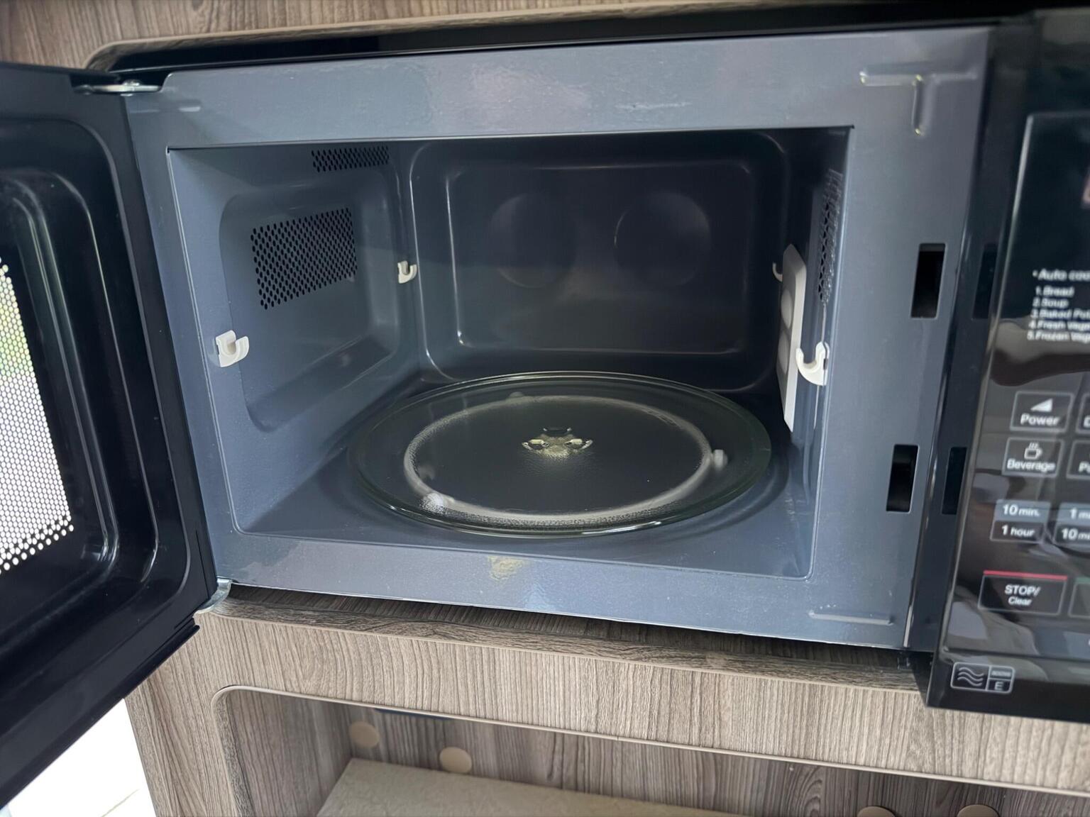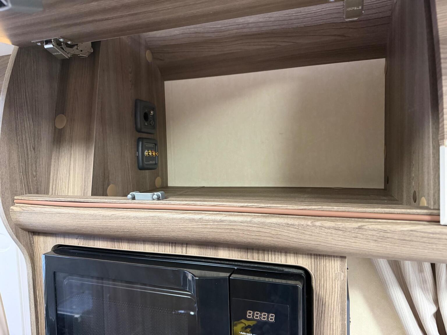 This is a spacious motorhome with a lovely lounge configuration at the front that allows for a social space and easily makes into either 2 singles or a large double bed for the night. The area benefits from a huge panoramic window located above the cab, allowing for plenty of natural light, and there is ample storage space surrounding the lounge. Towards the back wall is the fully equipped kitchen, featuring a grill, oven, hob, sink, microwave, extractor fan, and an electric omni vent. This area offers ample cupboard space and worktop space. On the offside, you will find the washroom, which features a sink, shower, and toilet.